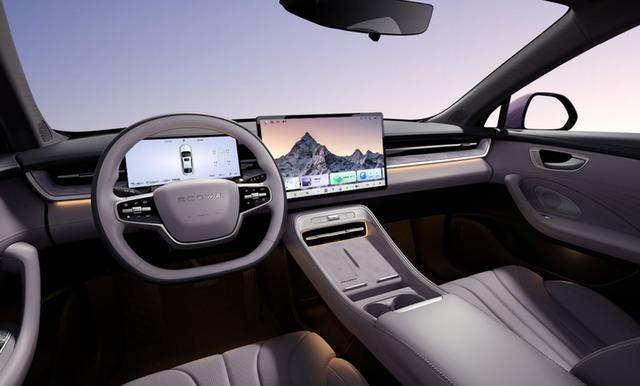 内饰方面的表现还不错,车内采用大家喜欢的简约风设计,配备有10.25英寸悬浮式仪表盘,以及15.6英寸悬浮式中控屏,屏幕后方空调出风口采用贯穿式布局,中央扶手箱前方设计有手机无线充面板,还保留了少量物理按键,采用怀挡式换挡机构,方向盘采用双幅式设计,中控台还加入了镀铬及不同纹理材质的面板进行装饰。