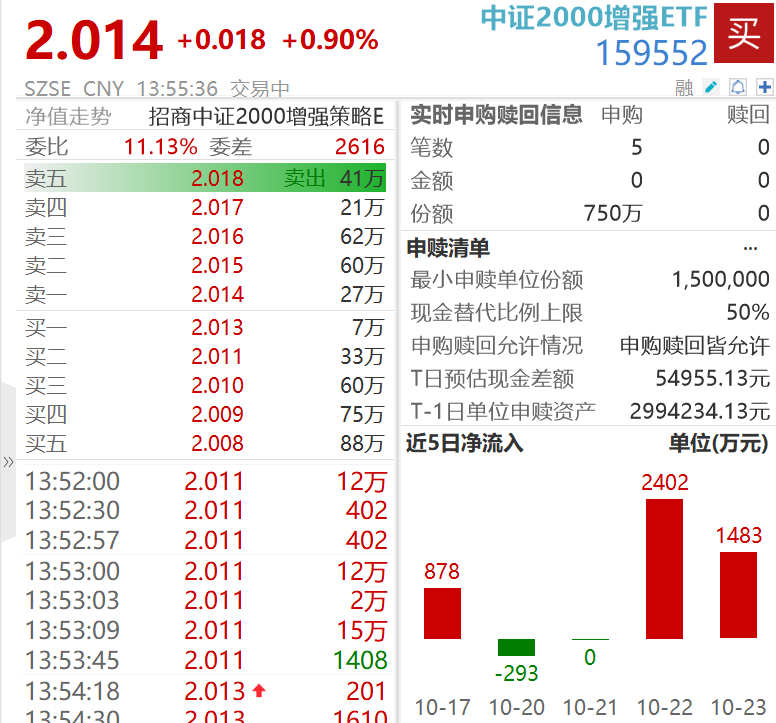 热门ETF中,截至发稿,中证2000增强ETF(159552)涨0.9%,实时价格2.014元。行情数据显示,该ETF盘中获净申购750万份,近两个交易日,该ETF获资金连续净流入3885万元。